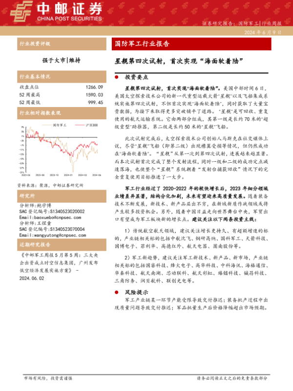 【中邮证券】【20240609】20240609-中邮证券-国防军工行业报告:星舰第四次试射,首次实现“海面软着陆”-18页 行业研究