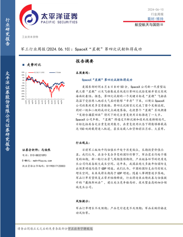 【太平洋证券】【20240610】20240610-太平洋-军工行业周报:SpaceX“星舰”第四次试射取得成功-17页 行业研究