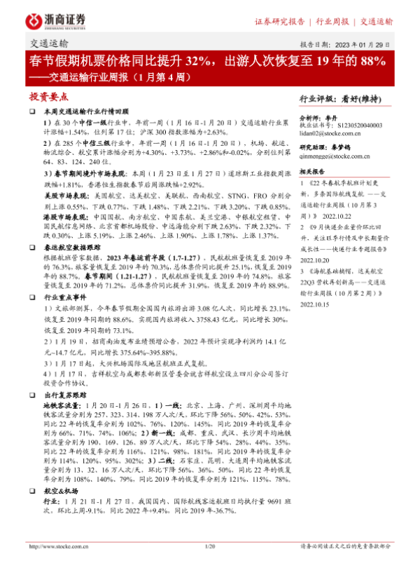 【浙商证券】【20230129】交通运输行业周报(1月第4周):春节假期机票价格同比提升32%,出游人次恢复至19年的88%-20页 行业研究