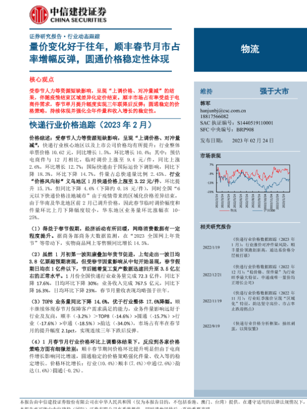 【中信建投证券】【20230224】物流行业:量价变化好于往年,顺丰春节月市占率增幅反弹,圆通价格稳定性体现-19页 行业研究