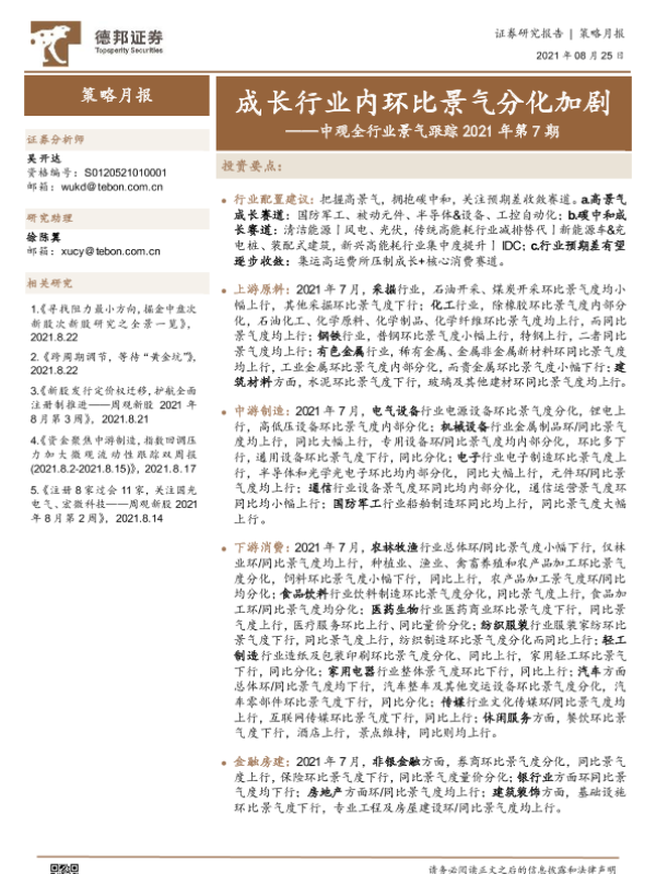 【德邦证券】【20210825】中观全行业景气跟踪2021年第7期:成长行业内环比景气分化加剧-52页 行业研究