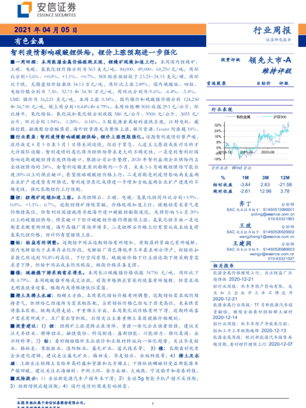【安信证券】【20210405】20210405-安信证券-有色金属行业周报:智利疫情影响碳酸锂供给,锂价上涨预期进一步强化-27页 行业研究