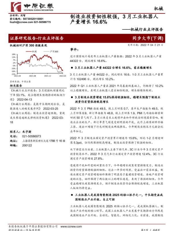 【中原证券】【20220421】制造业投资韧性较强,3月工业机器人产量增长16.6%-6页 行业研究