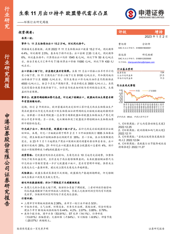 【申港证券】【20230102】生柴11月出口持平欧盟替代需求凸显-13页 行业研究
