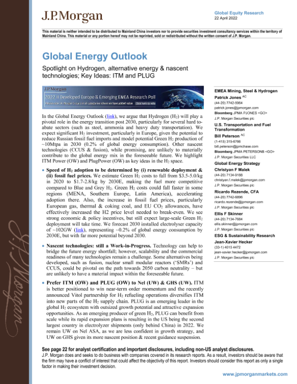 【J.P. Morgan】【20220422】全球能源行业-聚焦氢、替代能源和新兴技术-28页 行业研究