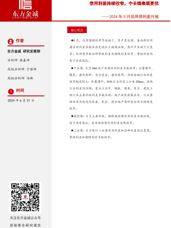 【东方金诚】【20240621】2024年5月信用债利差月报:信用利差持续收窄,中长端表现更优-16页 行业研究