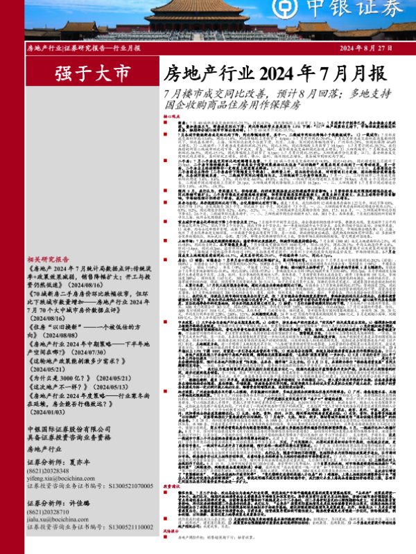 【中银证券】【20240827】房地产行业2024年7月月报:7月楼市成交同比改善,预计8月回落;多地支持国企收购商品住房用作保障房-26页 行业研究
