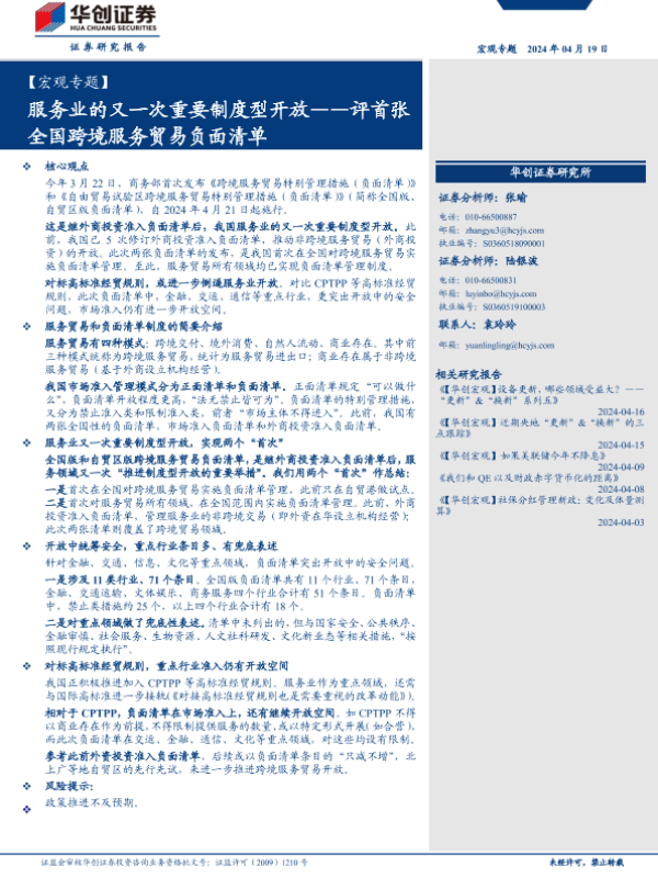 【华创证券】【20240419】评首张全国跨境服务贸易负面清单:服务业的又一次重要制度型开放-14页 行业研究