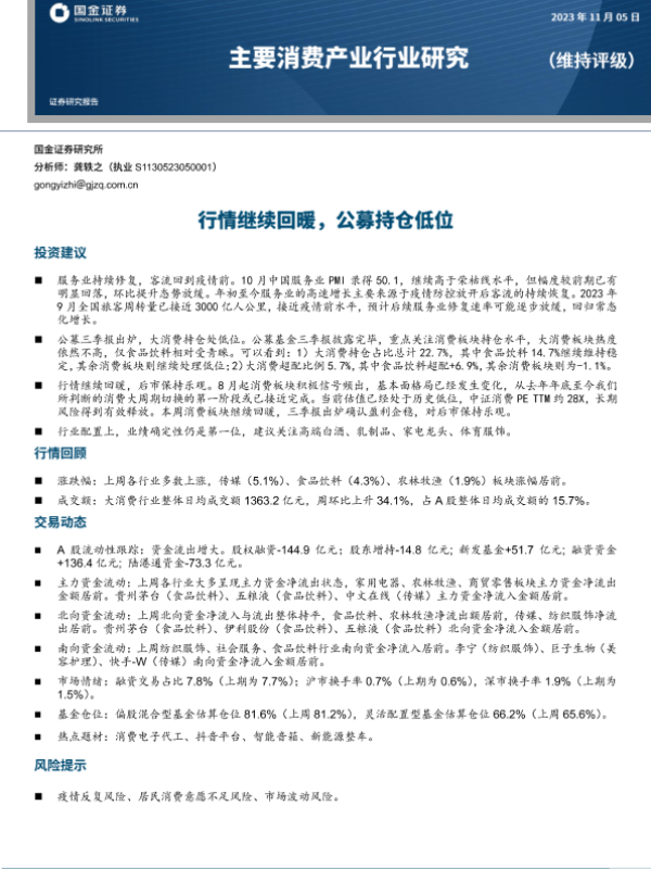 【国金证券】【20231105】主要消费产业行业研究:行情继续回暖,公募持仓低位-19页 行业研究
