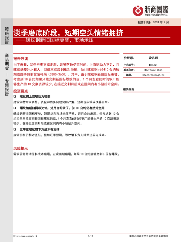 【浙商国际】【20240731】螺纹钢新旧国标更替,市场承压:淡季磨底阶段,短期空头情绪拥挤-12页 行业研究