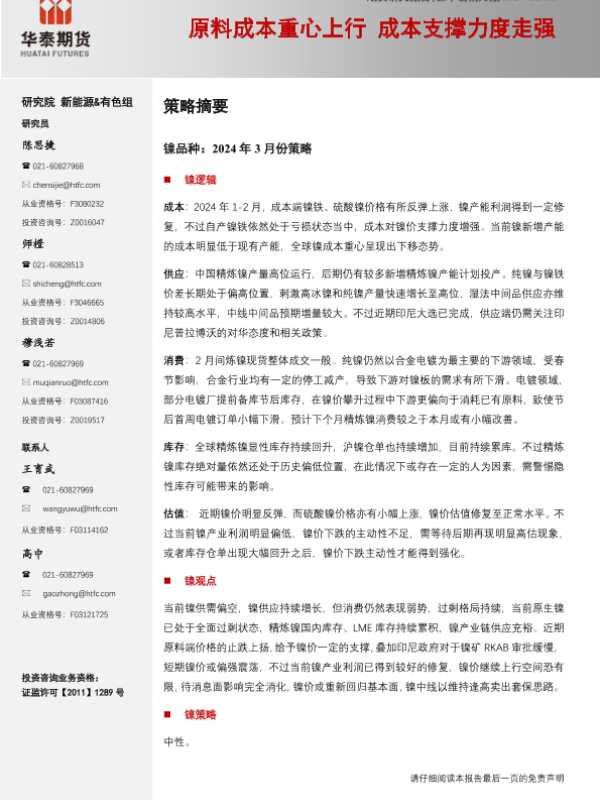 【华泰期货】【20240303】镍不锈钢月报:原料成本重心上行 成本支撑力度走强-36页 行业研究