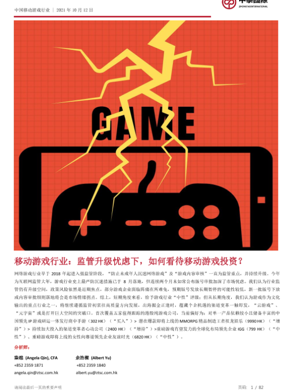 【中泰国际】【20211012】中国移动游戏行业:监管升级忧虑下,如何看待移动游戏投资?-82页 行业研究