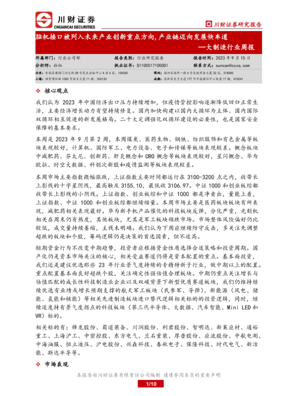 【川财证券】【20230915】20230915-川财证券-大制造行业周报:脑机接口被列入未来产业创新重点方向,产业链迈向发展快车道-10页 行业研究