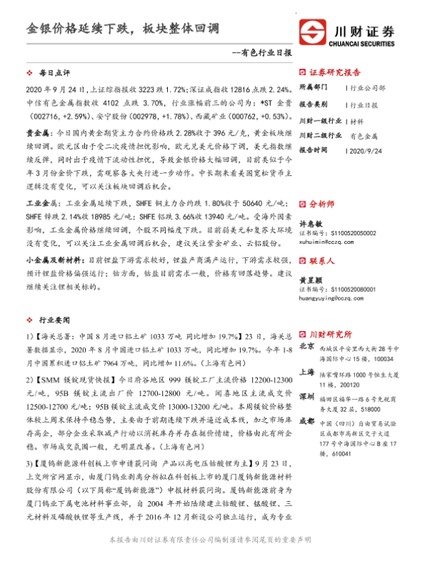 【川财证券】【20200924】有色行业日报:金银价格延续下跌,板块整体回调-3页 证券期货研究报告