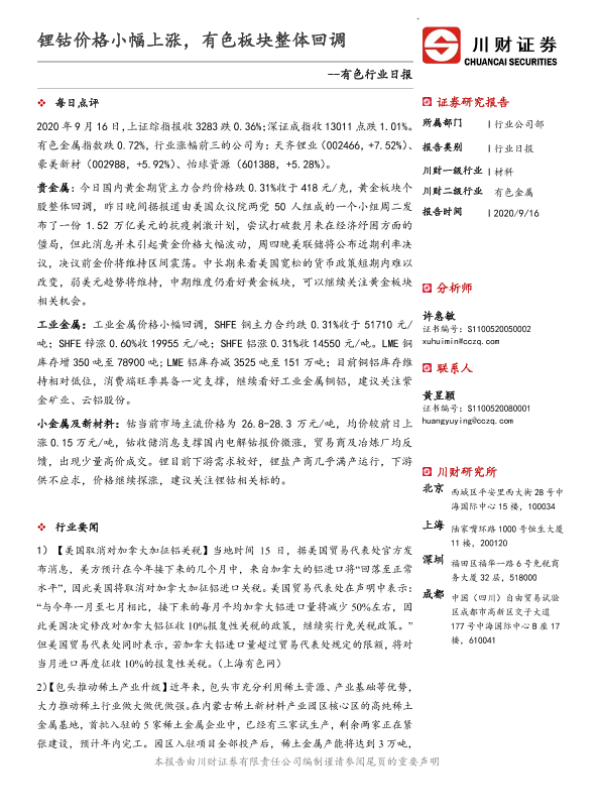 【川财证券】【20200916】有色行业日报:锂钴价格小幅上涨,有色板块整体回调-3页 证券期货研究报告