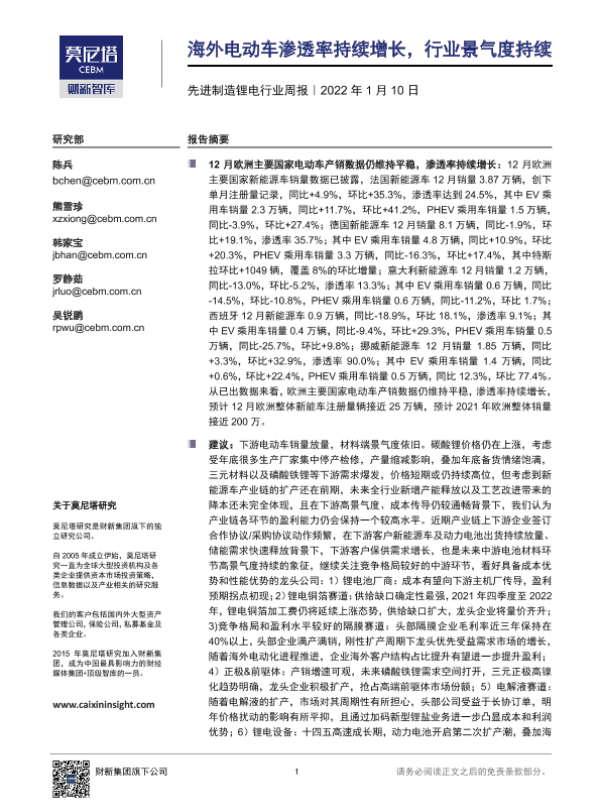 【莫尼塔研究】【20220110】先进制造锂电行业周报:海外电动车渗透率持续增长,行业景气度持续-12页 行业研究