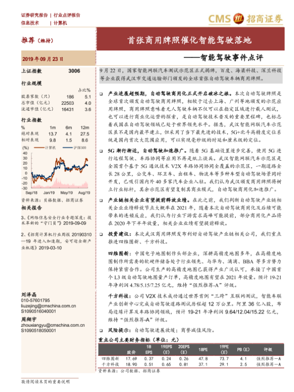 【海通证券】【20190923】智能驾驶事件点评:首张商用牌照催化智能驾驶落地-3页 行业研究
