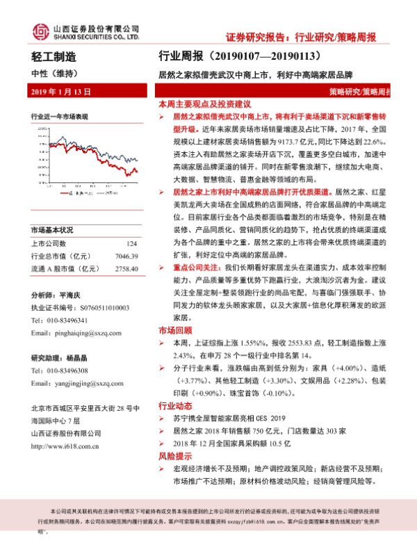 【山西证券】【20190113】轻工行业周报:居然之家拟借壳武汉中商上市,利好中高端家居品牌-14页 行业研究