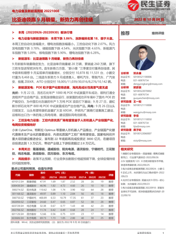 【民生证券】【20221008】电力设备及新能源周报:比亚迪领跑9月销量,新势力再创佳绩-34页 行业研究