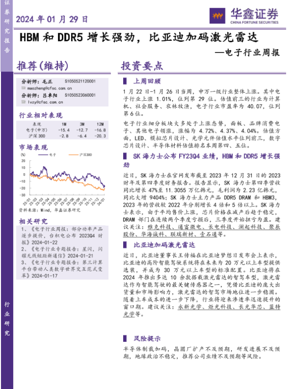 【华鑫证券】【20240129】20240129-华鑫证券-电子行业周报:HBM和DDR5增长强劲,比亚迪加码激光雷达-42页 行业研究