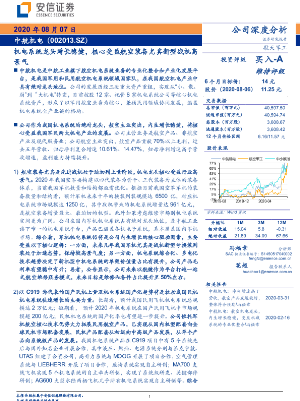 【安信证券】【20200807】机电系统龙头增长稳健,核心受益航空装备尤其新型战机高景气-26页 行业研究