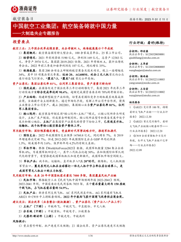 【浙商证券】【20230111】航空装备Ⅱ行业大制造央企专题报告:中国航空工业集团,航空装备铸就中国力量-36页 行业研究