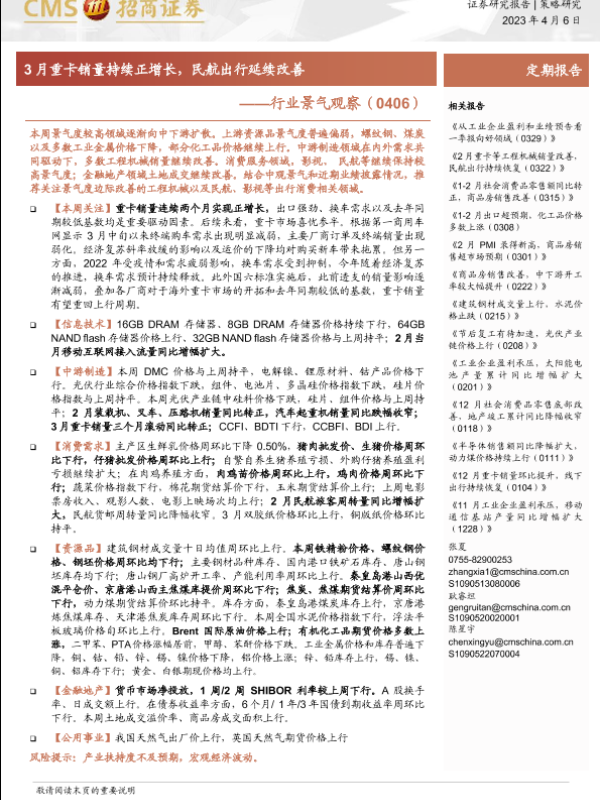 【海通证券】【20230406】行业景气观察:3月重卡销量持续正增长,民航出行延续改善-26页 行业研究