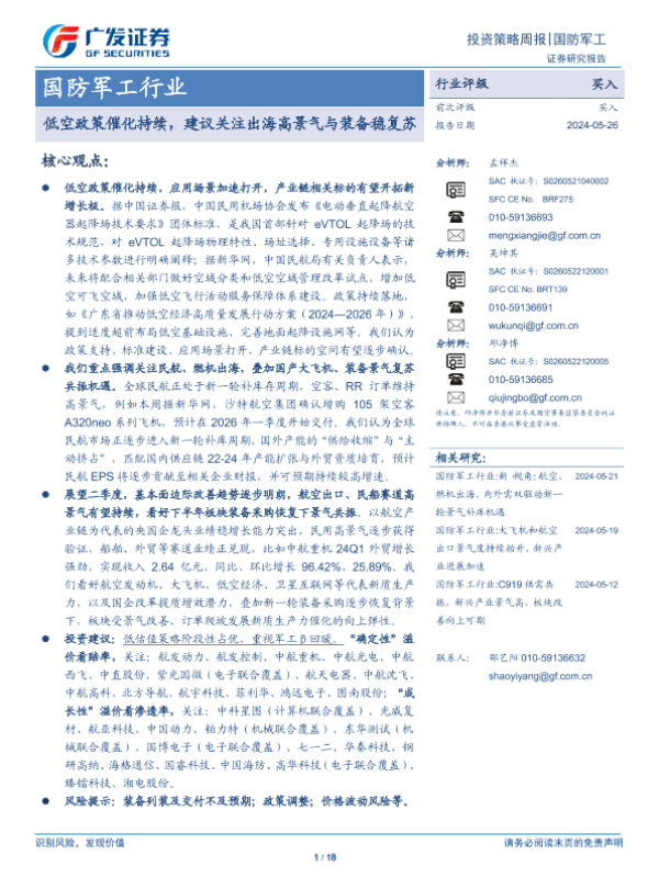 【广发证券】【20240526】低空政策催化持续,建议关注出海高景气与装备稳复苏-18页 行业研究