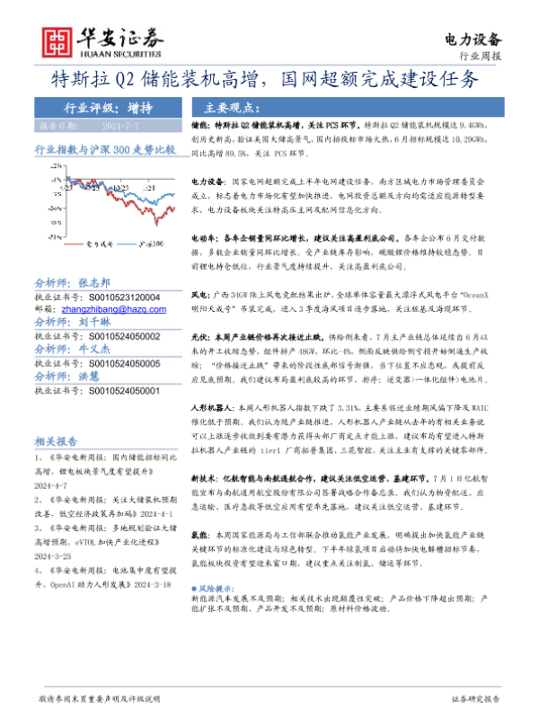 【华安证券】【20240707】20240707-华安证券-电力设备行业周报:特斯拉Q2储能装机高增,国网超额完成建设任务-25页 行业研究