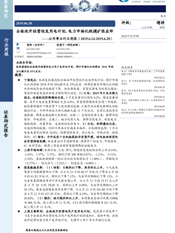 【国泰君安证券】【20190630】全面放开经营性发用电计划,电力市场化规模扩张在即-14页 行业研究