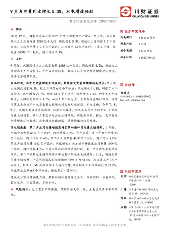 【川财证券】【20201020】9月发电量同比增长5.3%,水电增速强劲-2页 证券期货研究报告