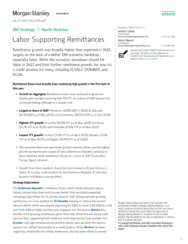 【Morgan Stanley】【20230712】Morgan Stanley Fixed-EM Strategy Labor Supporting Remittances-11页 行业研究