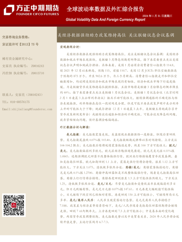 【方正中期期货】【20240131】全球波动率数据及外汇综合报告:美经济数据强劲助力政策维持高位 关注联储议息会议基调-18页 行业研究