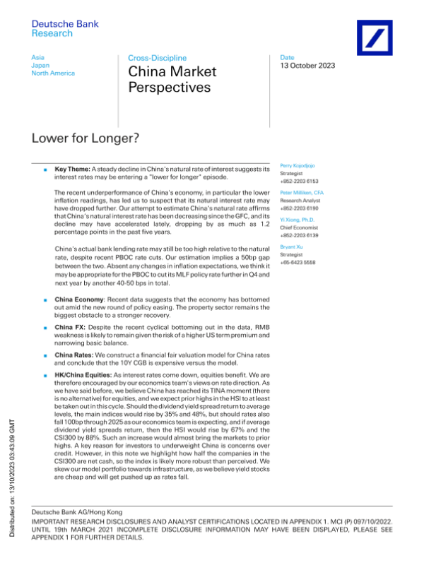 【Deutsche Bank】【20231013】Deutsche Bank-China Market Perspectives Lower for Longer-30页 宏观策略