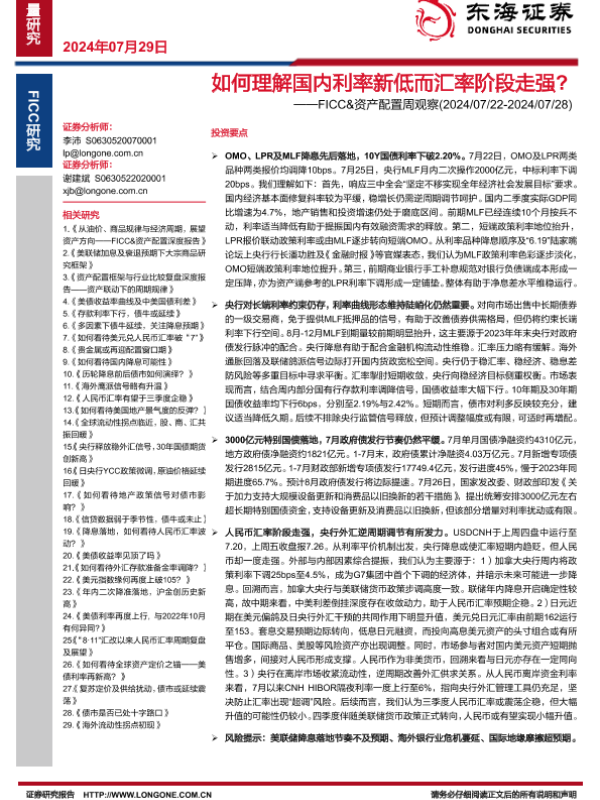 【东海证券】【20240729】FICC&资产配置观察:如何理解国内利率新低而汇率阶段走强?-15页 行业研究