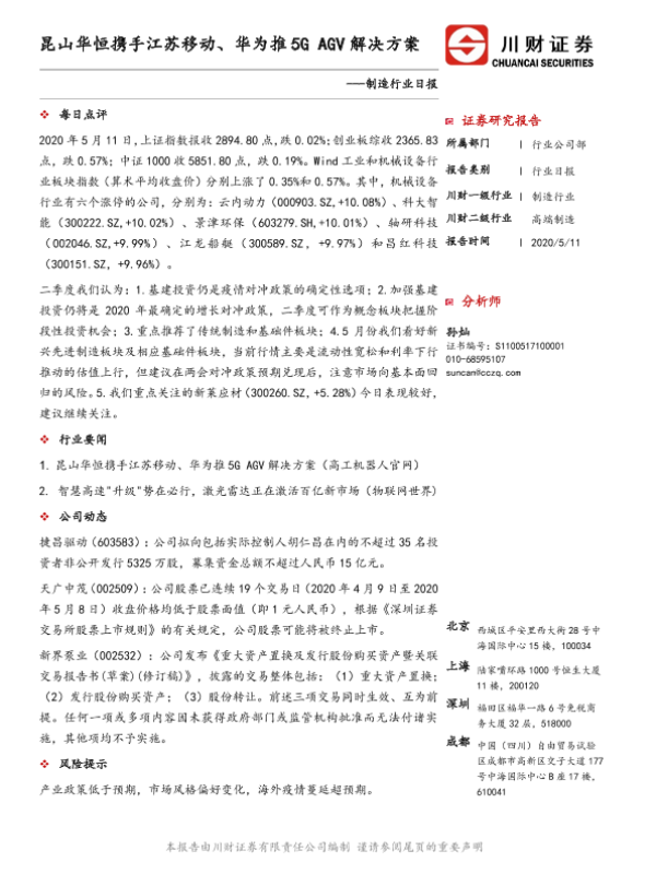 【川财证券】【20200511】制造行业日报:昆山华恒携手江苏移动、华为推5G AGV解决方案-2页 证券期货研究报告