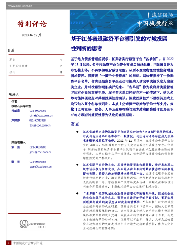 【中诚信国际】【202312】基于江苏省退融资平台潮引发的对城投属性判断的思考-10页 行业研究