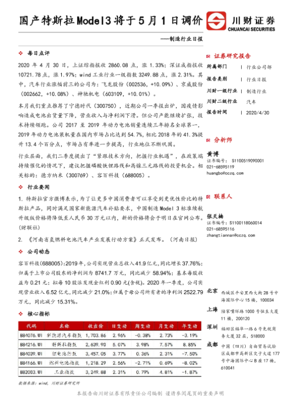 【川财证券】【20200430】制造行业日报:国产特斯拉Model3将于5月1日调价-3页 证券期货研究报告