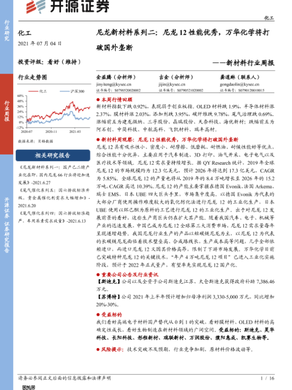 【开源证券】【20210704】尼龙新材料系列二:尼龙12性能优秀,万华化学将打破国外垄断-16页 行业研究