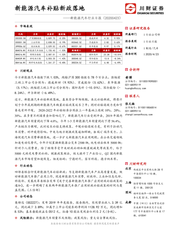 【川财证券】【20200423】新能源汽车行业日报:新能源汽车补贴新政落地-2页 证券期货研究报告