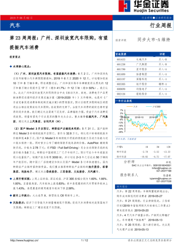 【华金证券】【20190602】汽车第23周周报:广州、深圳放宽汽车限购,有望提振汽车消费-12页 行业研究