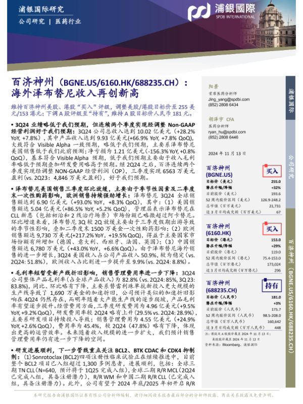【浦银国际】【20241113】百济神州(688235)海外泽布替尼收入再创新高-10页 行业研究