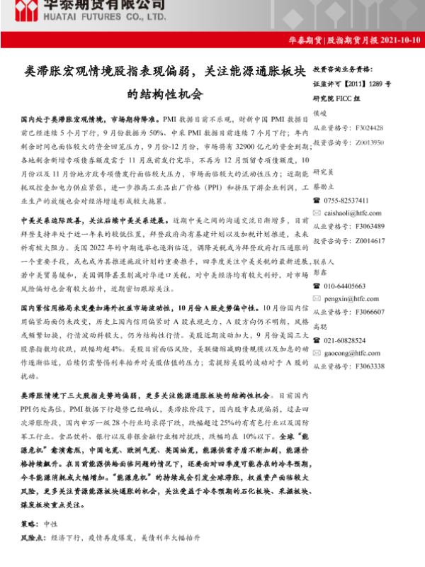 【华泰期货】【20211010】股指期货月报:类滞胀宏观情境股指表现偏弱,关注能源通胀板块的结构性机会-20页 行业研究