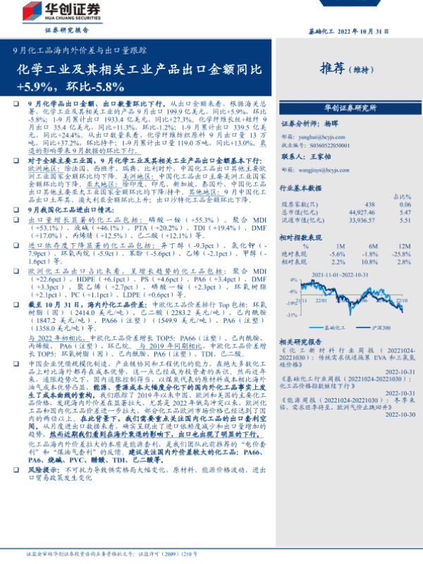 【华创证券】【20221031】基础化工行业9月化工品海内外价差与出口量跟踪-91页 行业研究