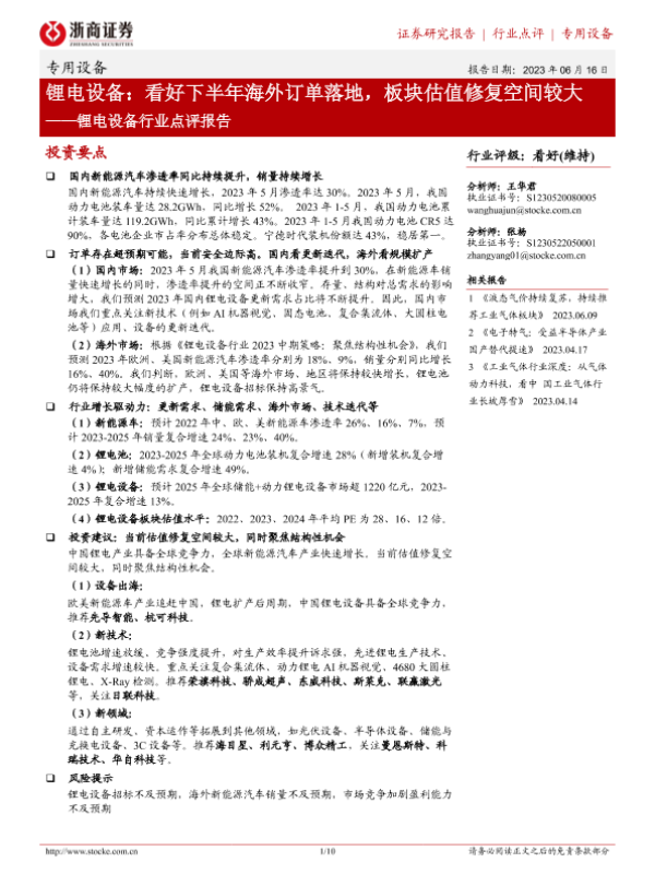 【浙商证券】【20230616】锂电设备:看好下半年海外订单落地,板块估值修复空间较大-10页 行业研究