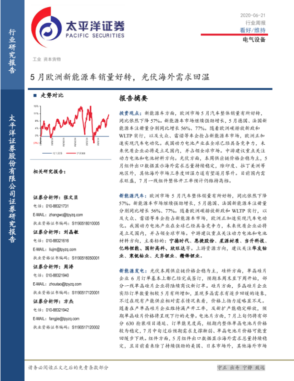 【太平洋证券】【20200621】20200621-太平洋-电气设备行业周报:5月欧洲新能源车销量好转,光伏海外需求回温-17页 行业研究