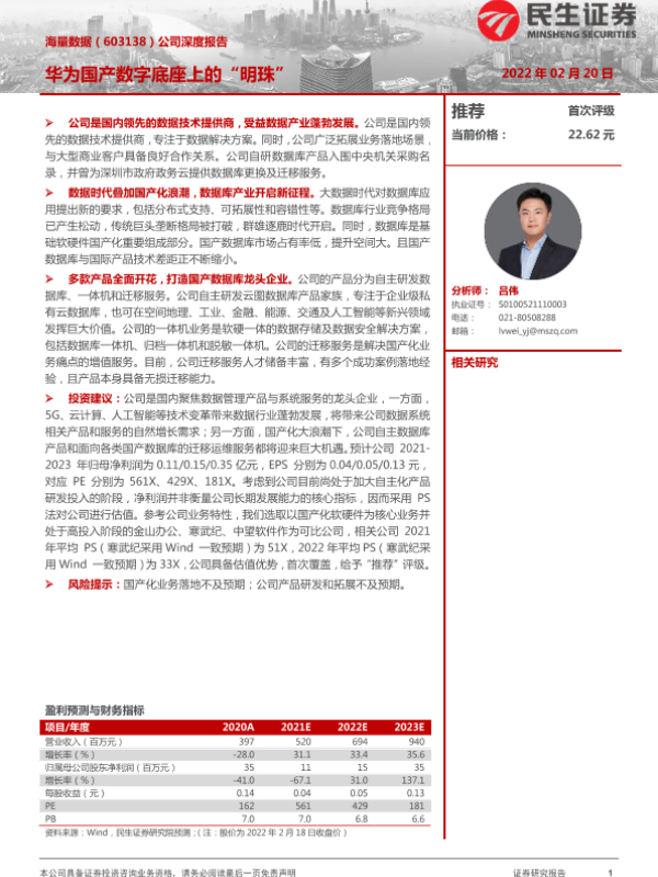 【民生证券】【20220220】20220220-民生证券-海量数据-603138.SH-公司深度报告:华为国产数字底座上的“明珠”-22页 行业研究