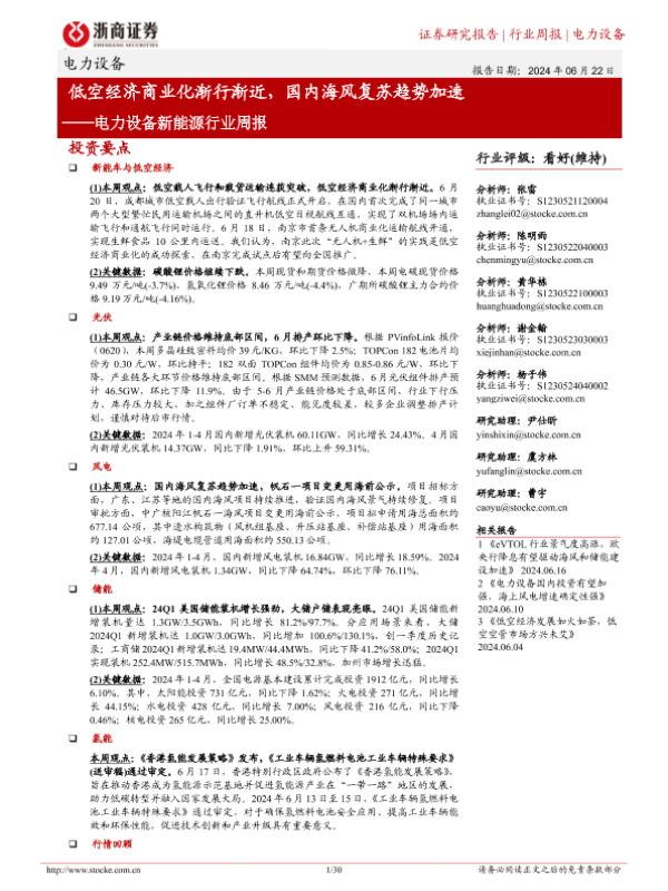 【浙商证券】【20240622】电力设备新能源行业周报:低空经济商业化渐行渐近,国内海风复苏趋势加速-30页 行业研究