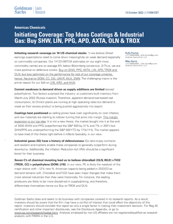 【Goldman Sachs】【20221013】Ideas Coatings & Industrial Gas_ Buy SHW, LIN, PPG, APD, AXTA, OLN & TROX-88页 行业研究