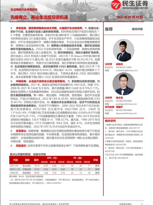 【民生证券】【20230830】生活用纸行业专题报告:先破再立,再论生活纸投资机遇-49页 行业研究